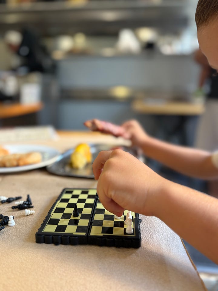 Su pediatra, que hacía un mes le había dado antibióticos a Lorenzo por una otitis, recomendó tenerlo en casa el fin de semana: nada de pantallas, playa, sol ni actividades donde pudiera golpearse. Así que jugamos mucho al ajedrez, su nueva pasión. Es interesante verlo jugar contra sí mismo cuando yo me tomo un descanso.