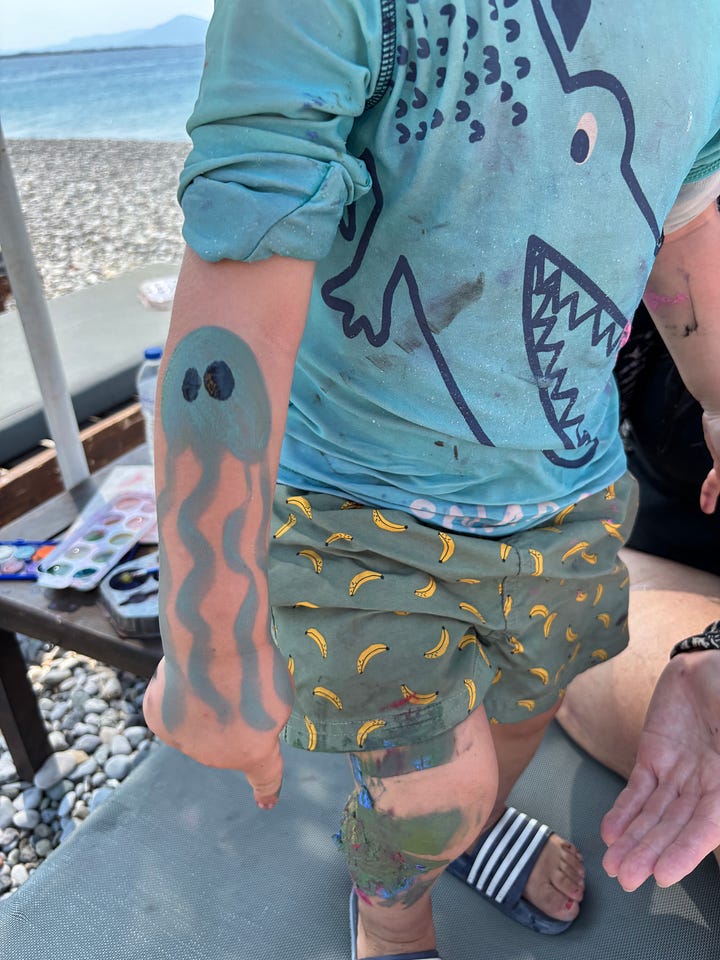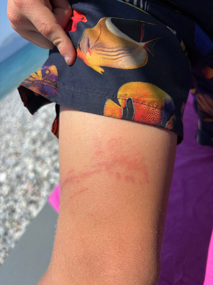 El miércoles, mientras jugaba con tres adolescentes en el agua, a Lorenzo le picó una medusa. Aprendimos qué hacer: lavar con agua salada, no con agua corriente, y usar bicarbonato de sodio con vinagre. Si la reacción es demasiado fuerte, ir a urgencias.
